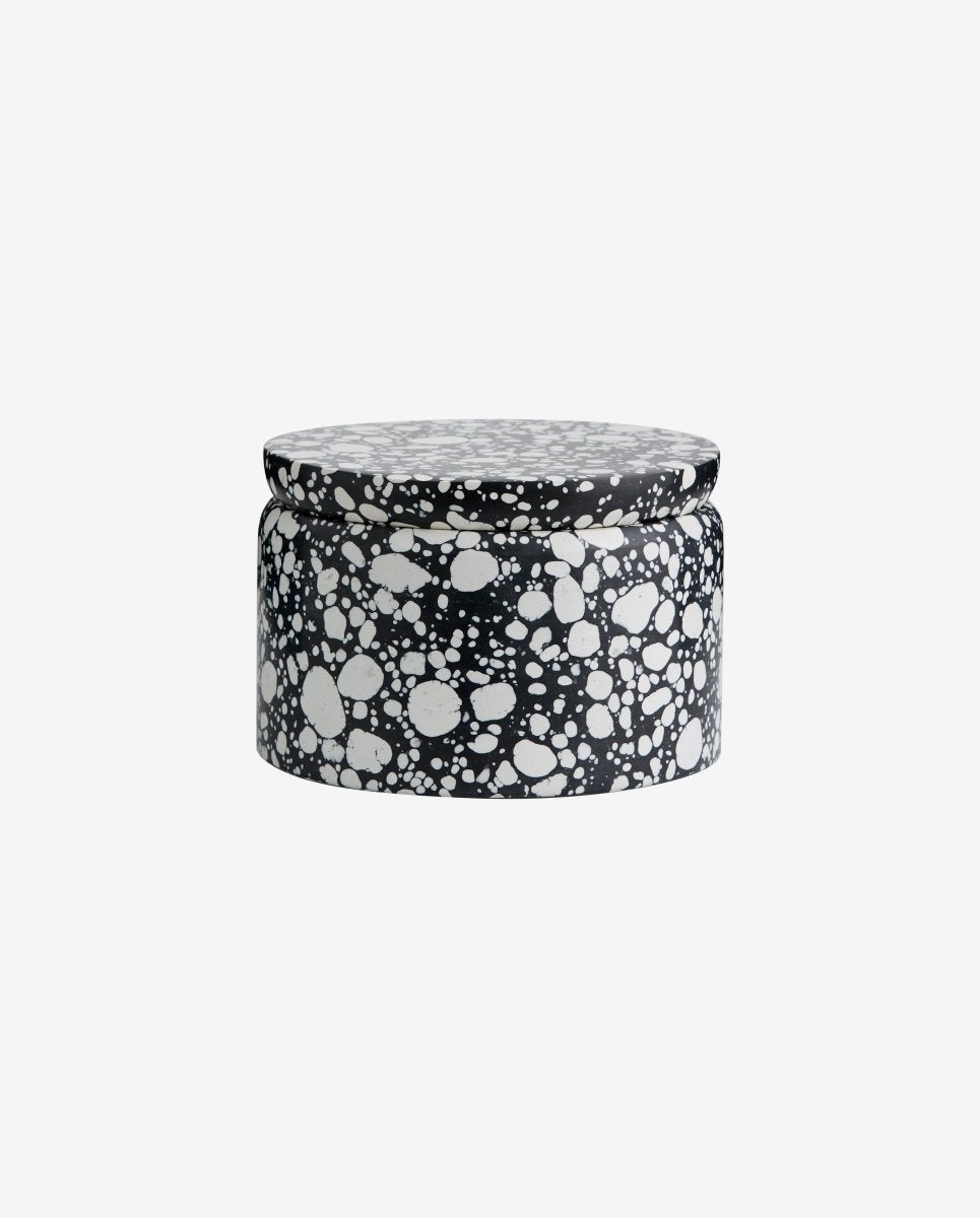 MULES opbevaringskrukke med låg kombinerer funktionalitet med et traditionelt, men tidløst design. Krukken, som er lavet i sort og hvid terrazzo, tilføjer et stilsikkert element til indretningen. En dekorativ krukke med et unikt udtryk til kontoret, badeværelset eller stuen, hvor små ting nemt kan organiseres og gemmes væk.