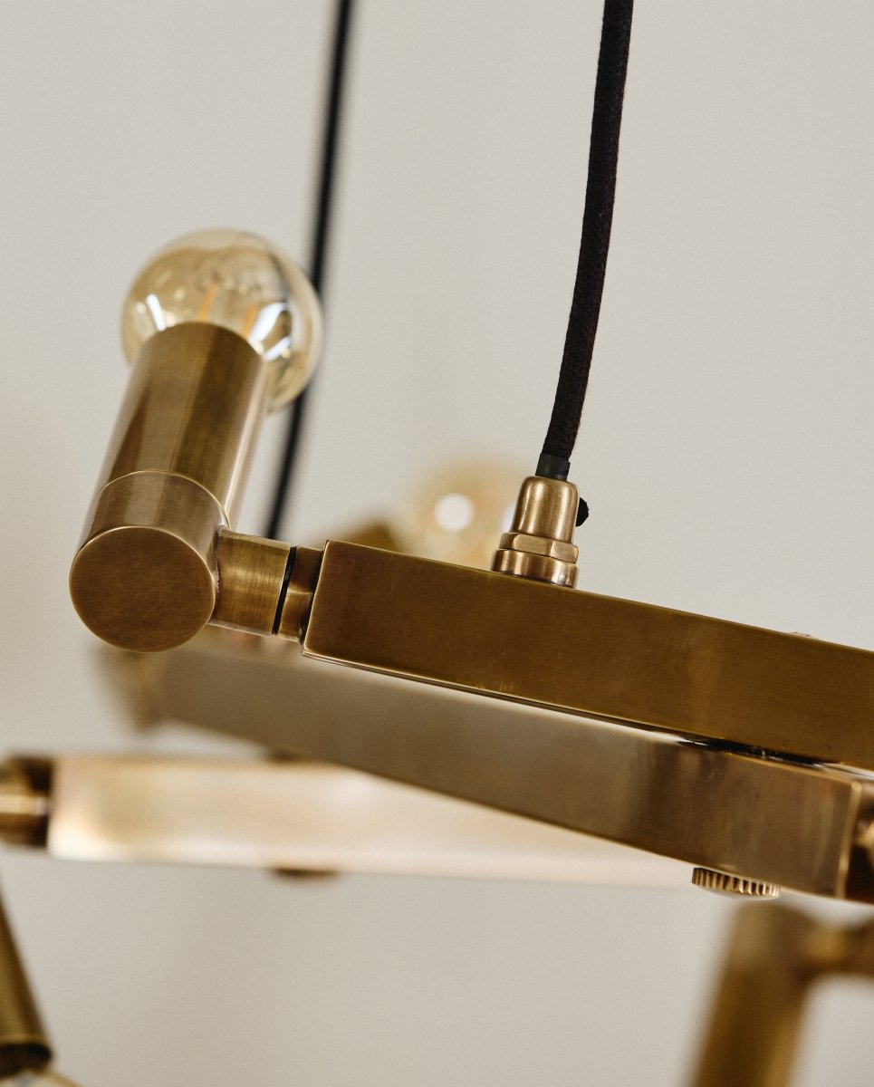 Elegant lysekrone i massiv messing med plads til ialt 10 pærer. Lysekronen har et utroligt smukt og eksklusivt design i en enkel, geometrisk form med 4 kvadratiske stænger, hvorpå der sidder ialt 10 fatninger. 5 sorte ledningsophæng udgår herfra og samles øverst oppe i lampeophænget. Ledningsophæng kan afkortes. Diameteren på lampen er 75 cm og højden 105 cm.
