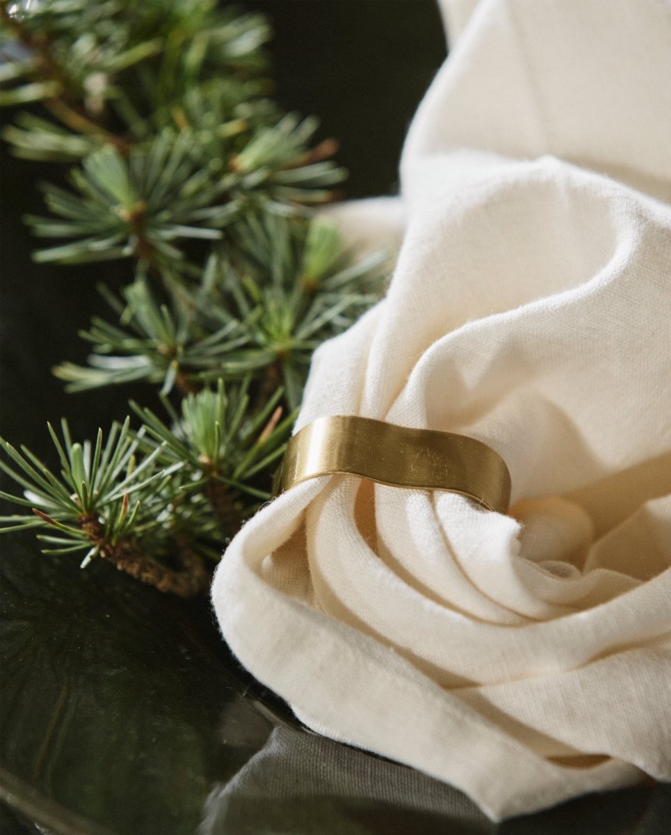 Elegant servietring i messing i en smuk, organisk form og med en mat finish, der gør det ekstra smukt at arrangere servietterne, når bordet skal dækkes. Formen på ringen kan variere lidt, hviket gør hver servietring unik.