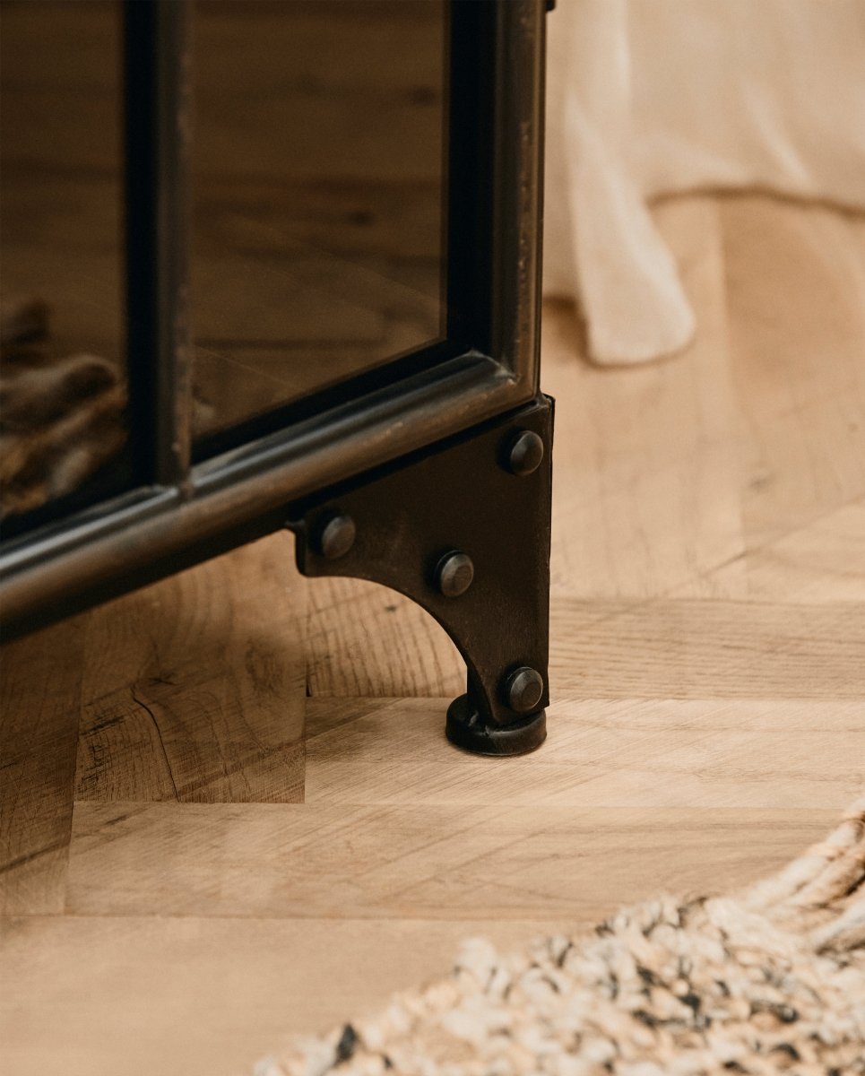 Smukt DOWNTOWN vitrineskab fremstillet af jern med en sortlakeret, patineret overflade, der giver skabet et flot, rustikt look.