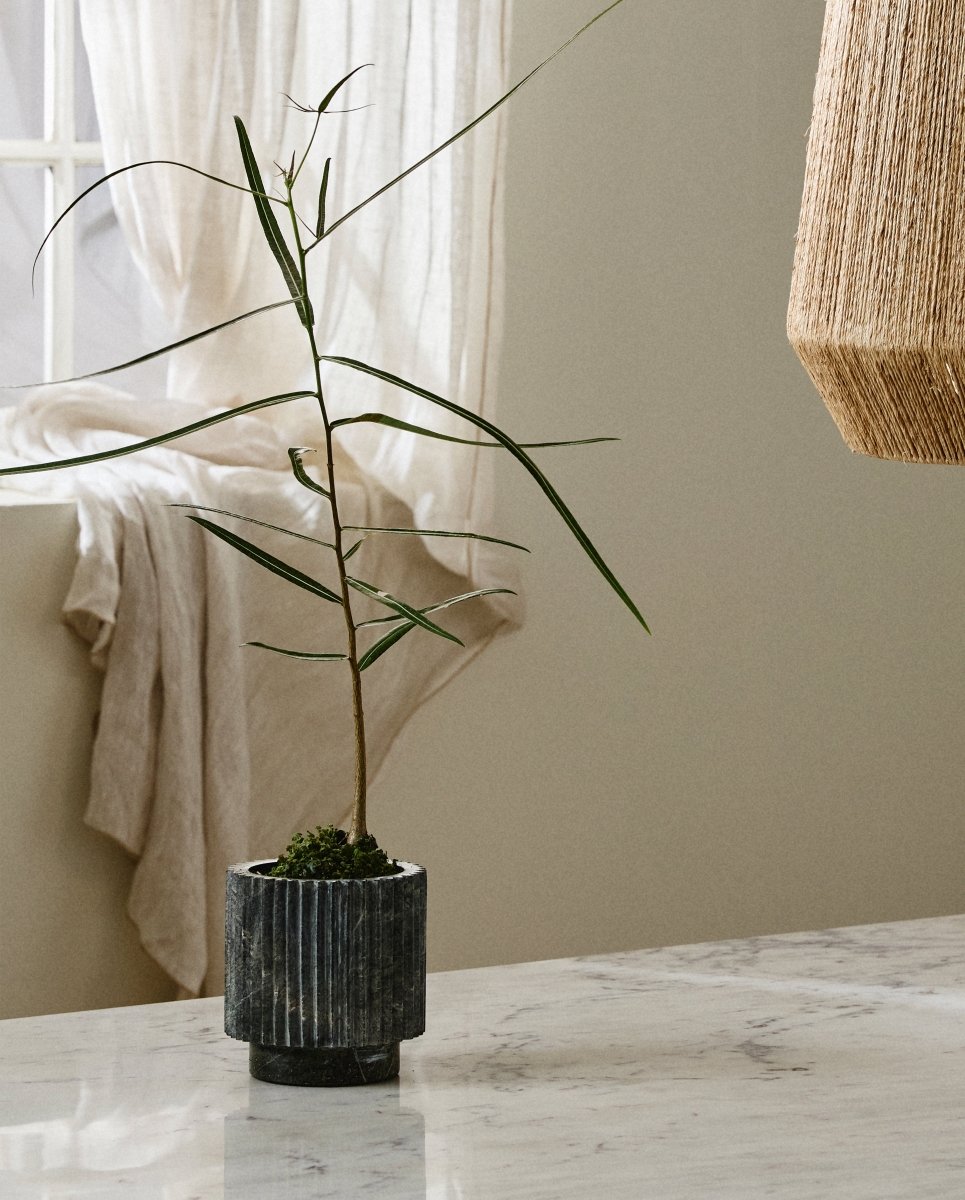 Stilren urtepotte i grøn marmor med riller. Da marmor er et naturmatriale, er hver urtepotte unik i farve og struktur.
