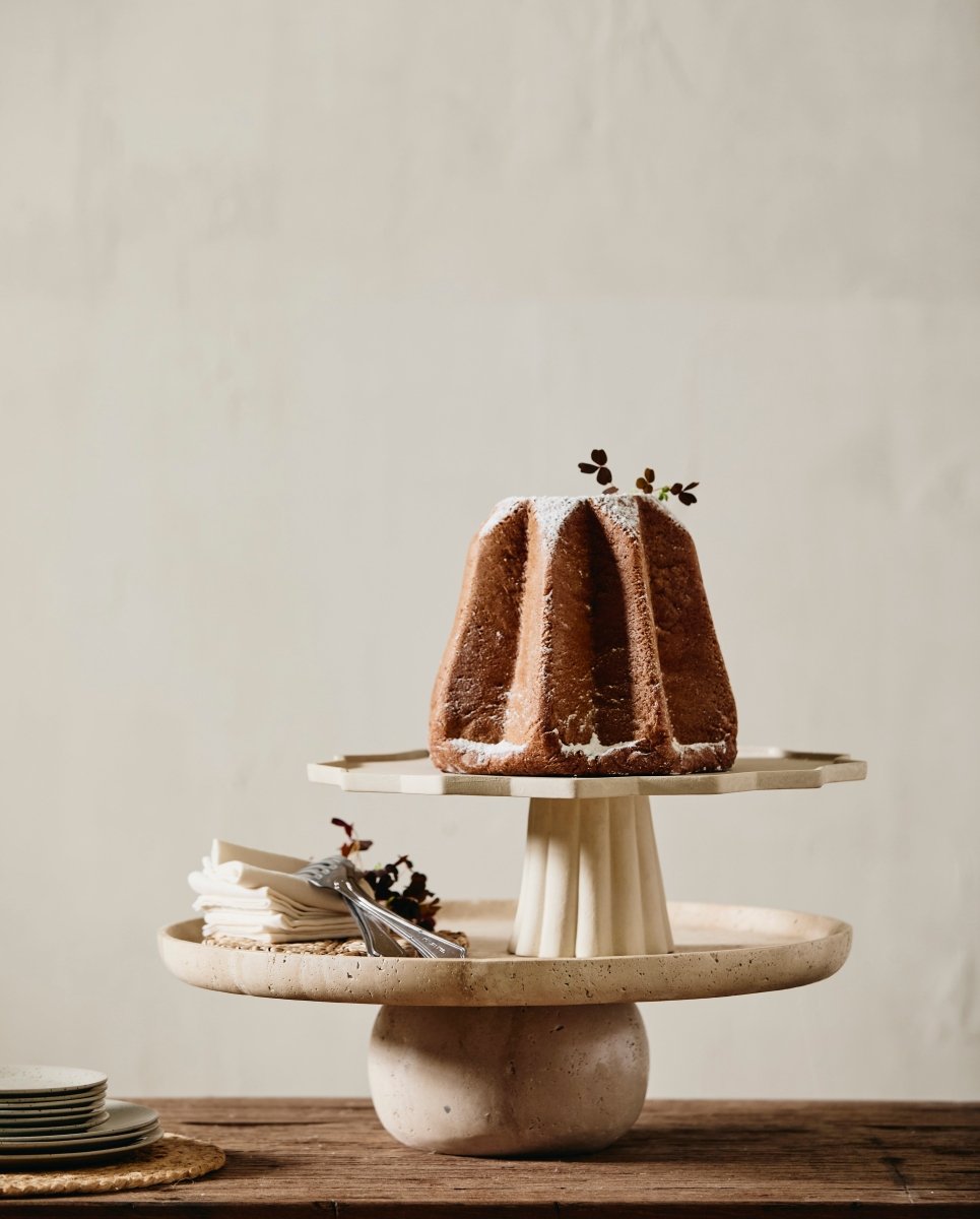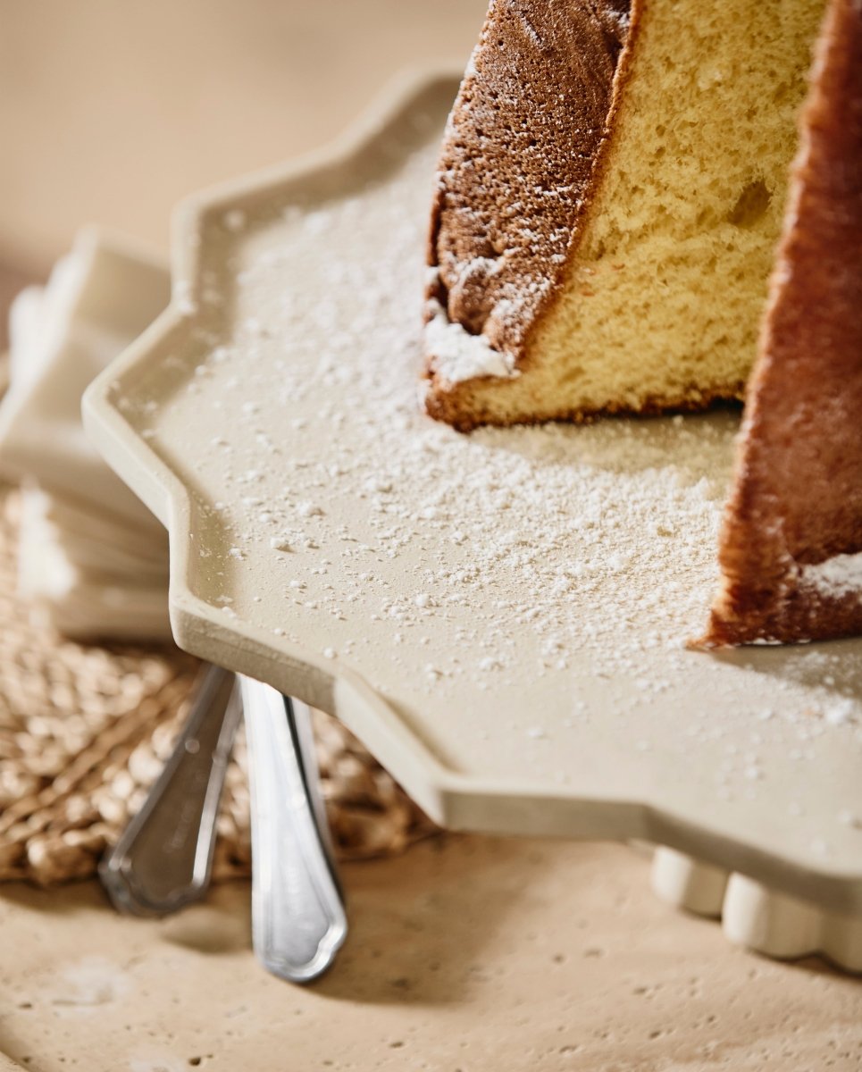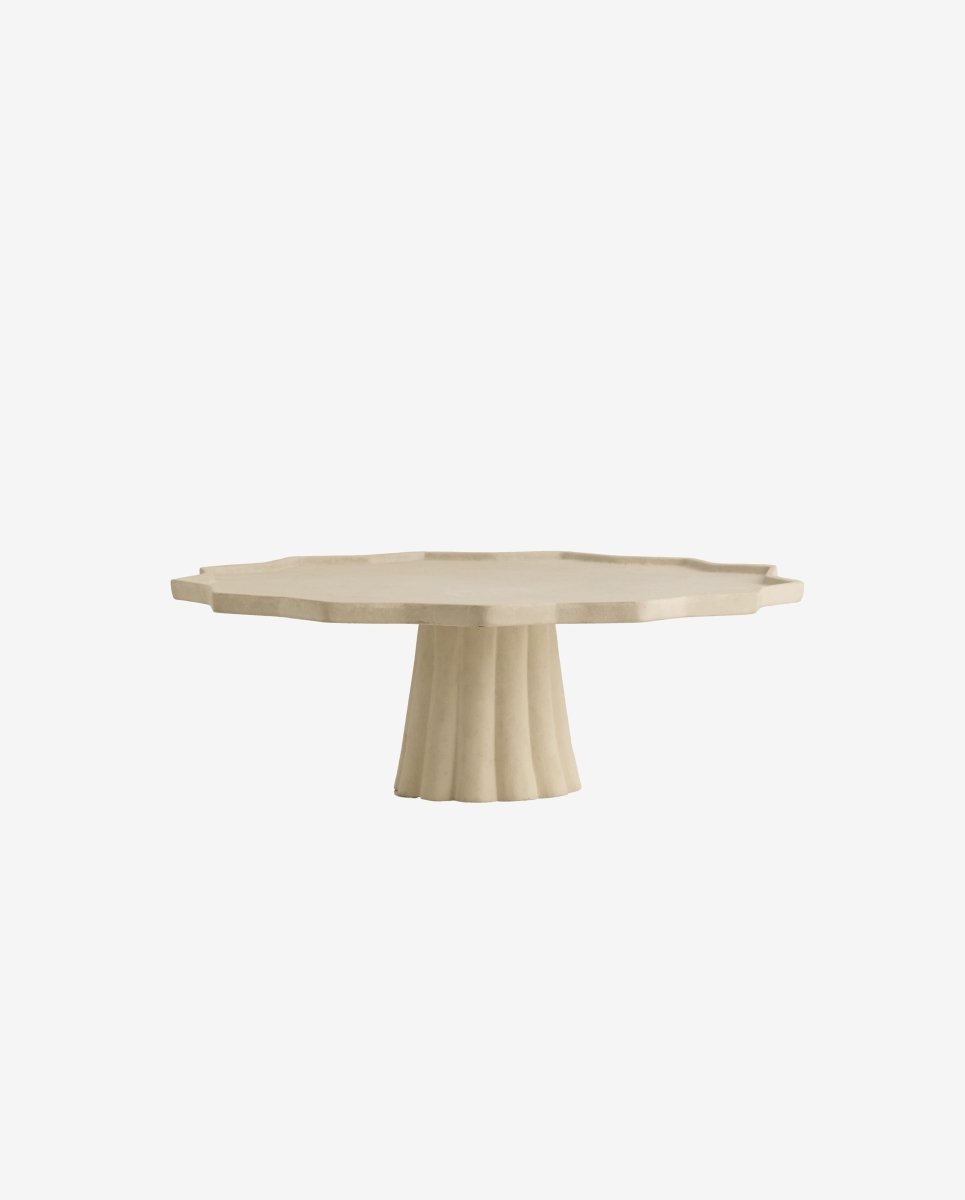 Med sin runde, let bølgede kant og fodens lodrette riller, har fadet et klassisk udtryk,hvor de plisserede detaljer tilføjer både elegance og ynde.Det er perfekt til servering af kager eller andre lækkerier, mens fadet også fungerer som et dekorativt midtpunkt på bordet.