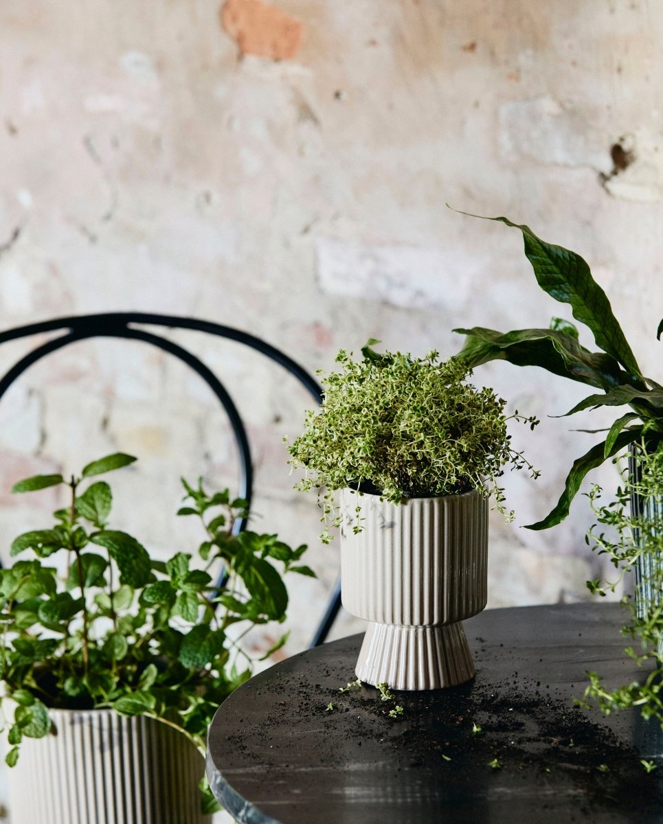 Dekorativ urtepotte med riller, fremstillet af stentøj og med en smuk glasur der kan varierer i farven fra produkt til produkt. Urtepotten fås i 3 størrelser og 2 farver, og er fine at mixe i indretningen.