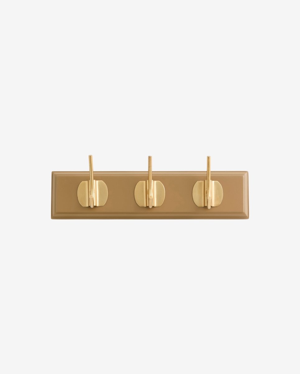 EDGY knagerække er fremstillet i træ med tre messingfarvede knager.