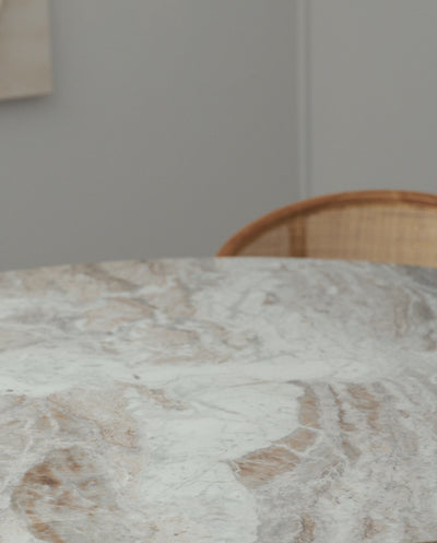 ERIE kommer med en unik bordplade lavet af marmor, der har et flot farvespil i naturlige nuancer.