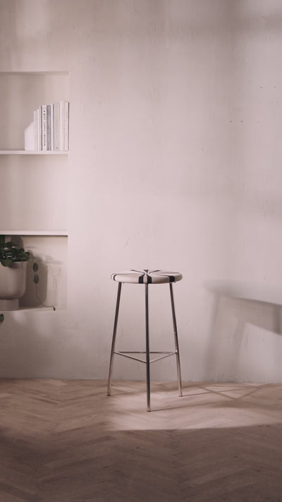 En skammel i perfekt balance mellem det rå, elegante og moderne design. MORICE skamlen har et smukt håndflettet sæde i naturlige nuancer, hvor det karakteristiske mønster skaber et dynamisk og iøjefaldende look. I kombinationen mellem den blanke overflade og det geometriske sæde, gives der et let udtryk og et varmt, samt industrielt touch, tilføjes til indretningen.