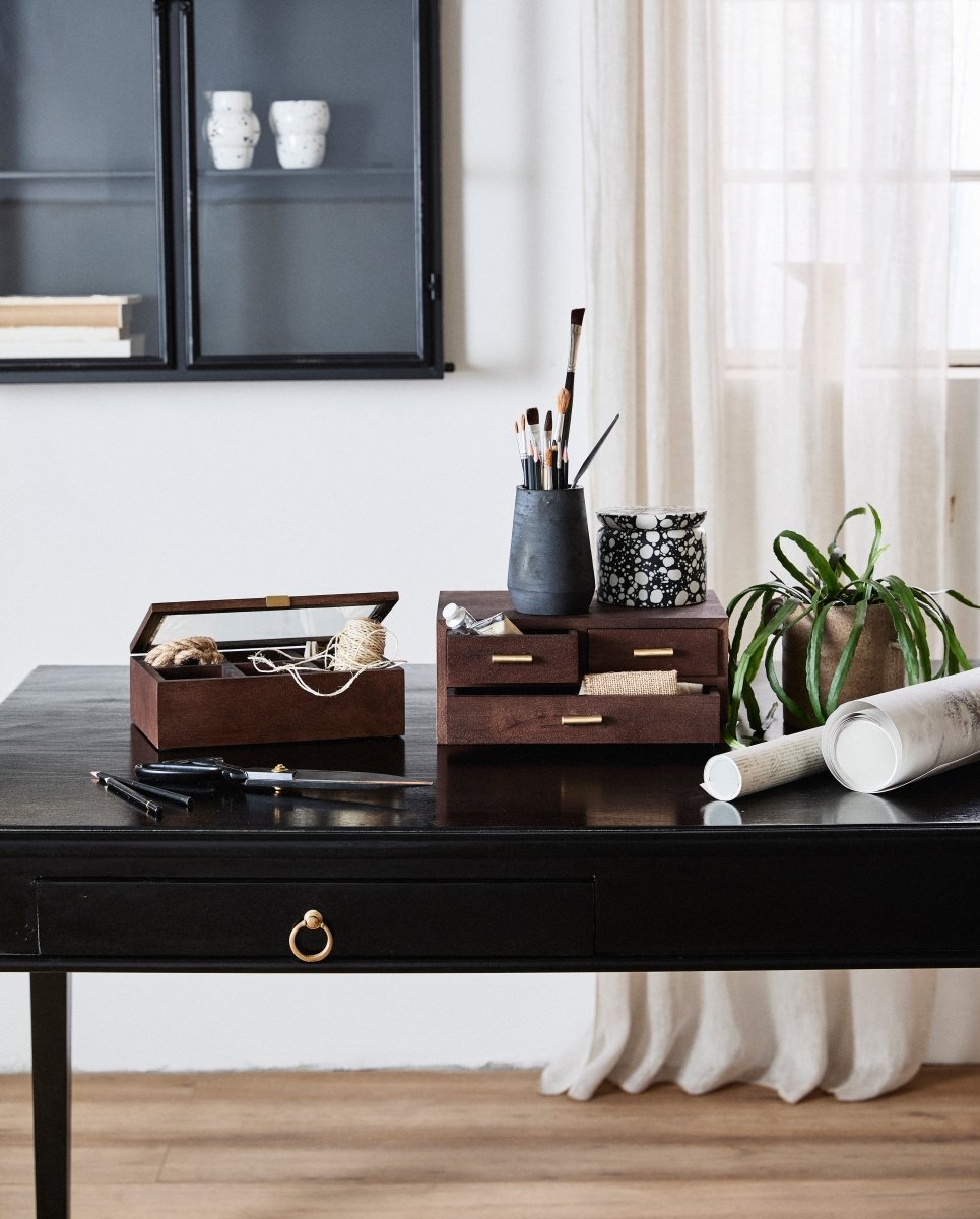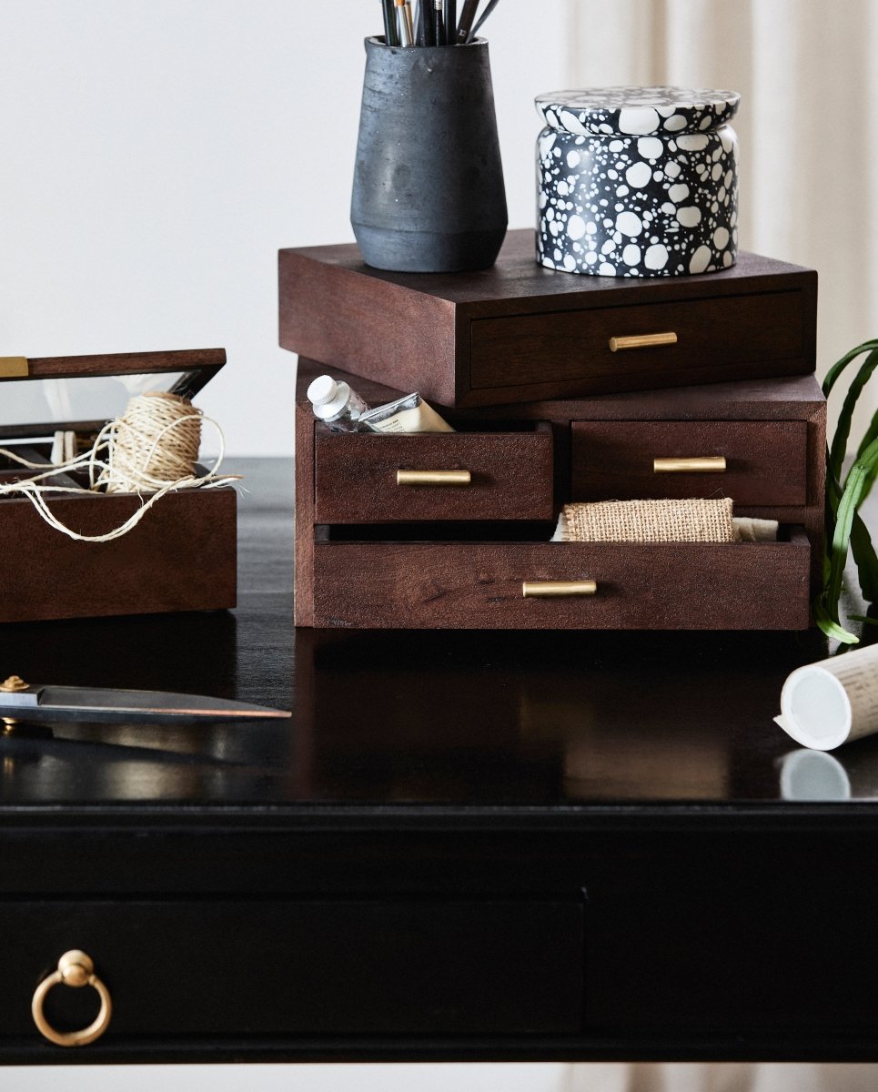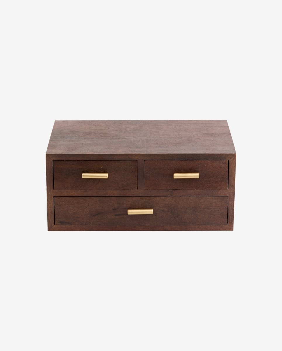 SUVA et et opbevaringsæske med tre skuffer i mørkt bejdset mangotræ og med messingfarvede håndtag. SUVA kan let placeres på et bord eller i et skab og er ideel til opbevaring af mindre genstande såsom smykker, kreativitet osv.