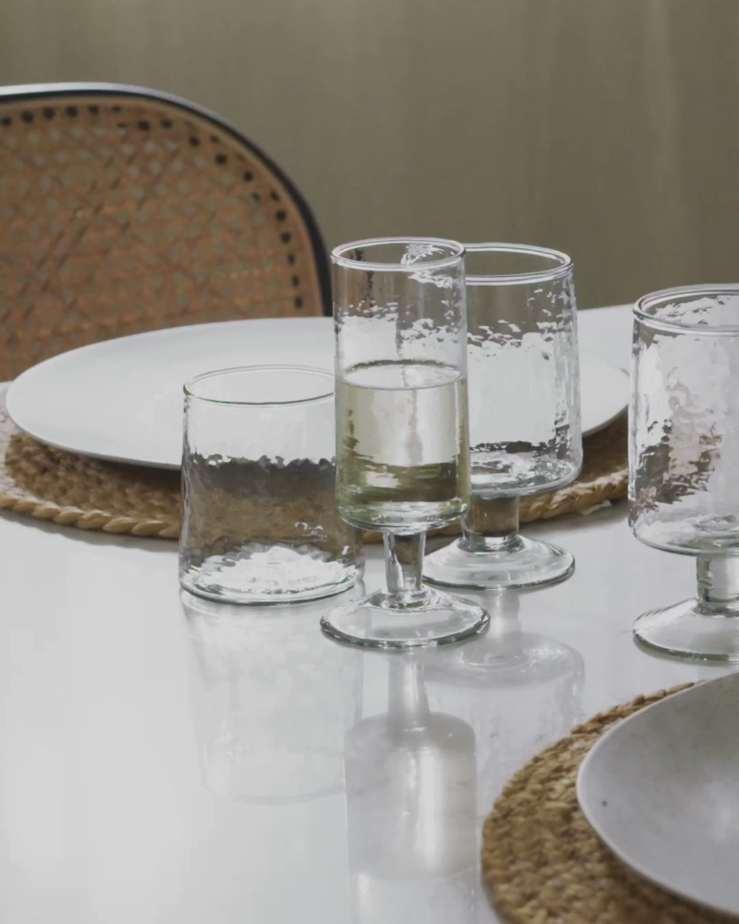 Hvert glas er unikt med små variationer i form, tykkelse og luftbobler – tydelige spor af den håndværksmæssige proces, som giver hvert glas sin særlige charme.